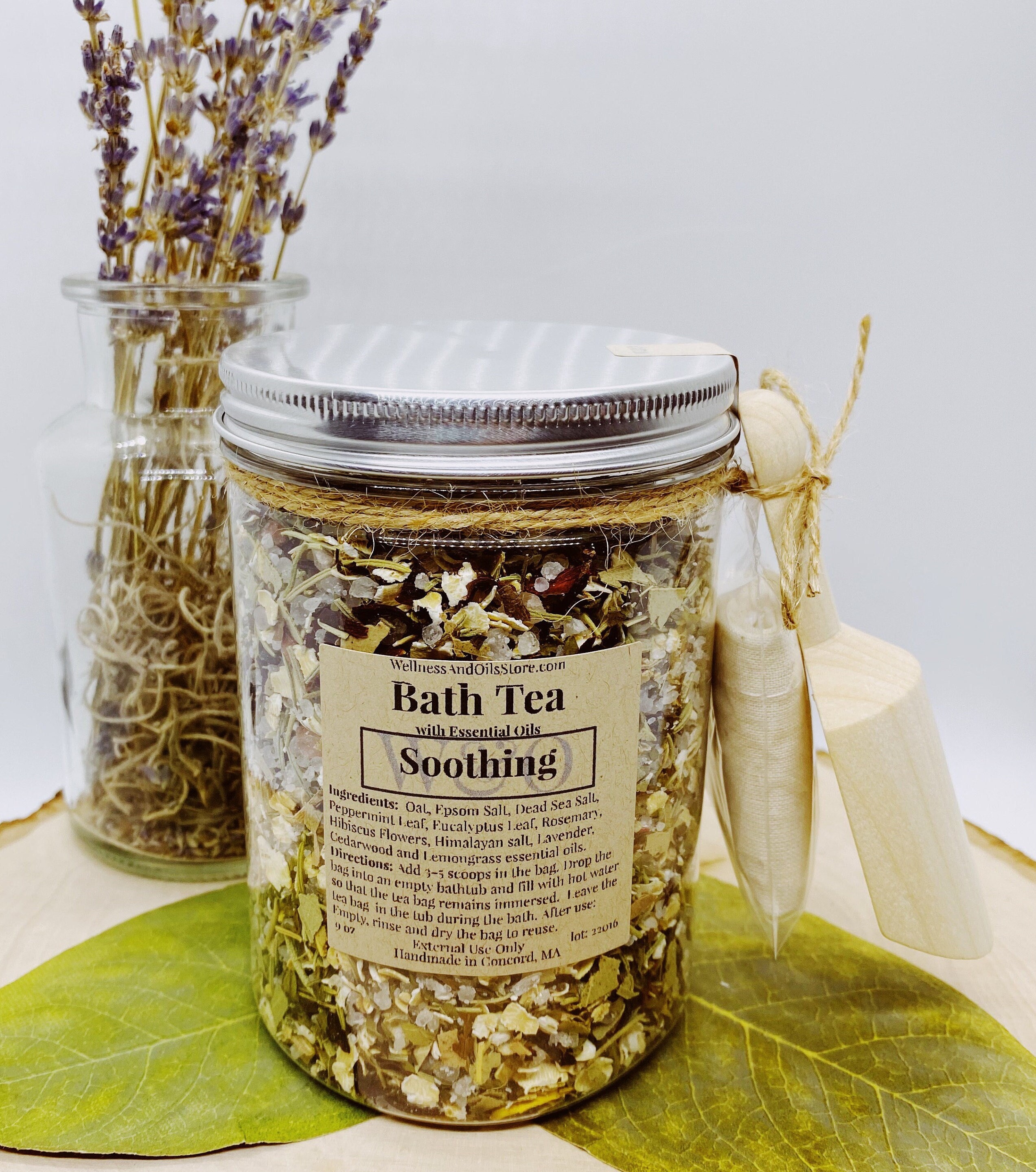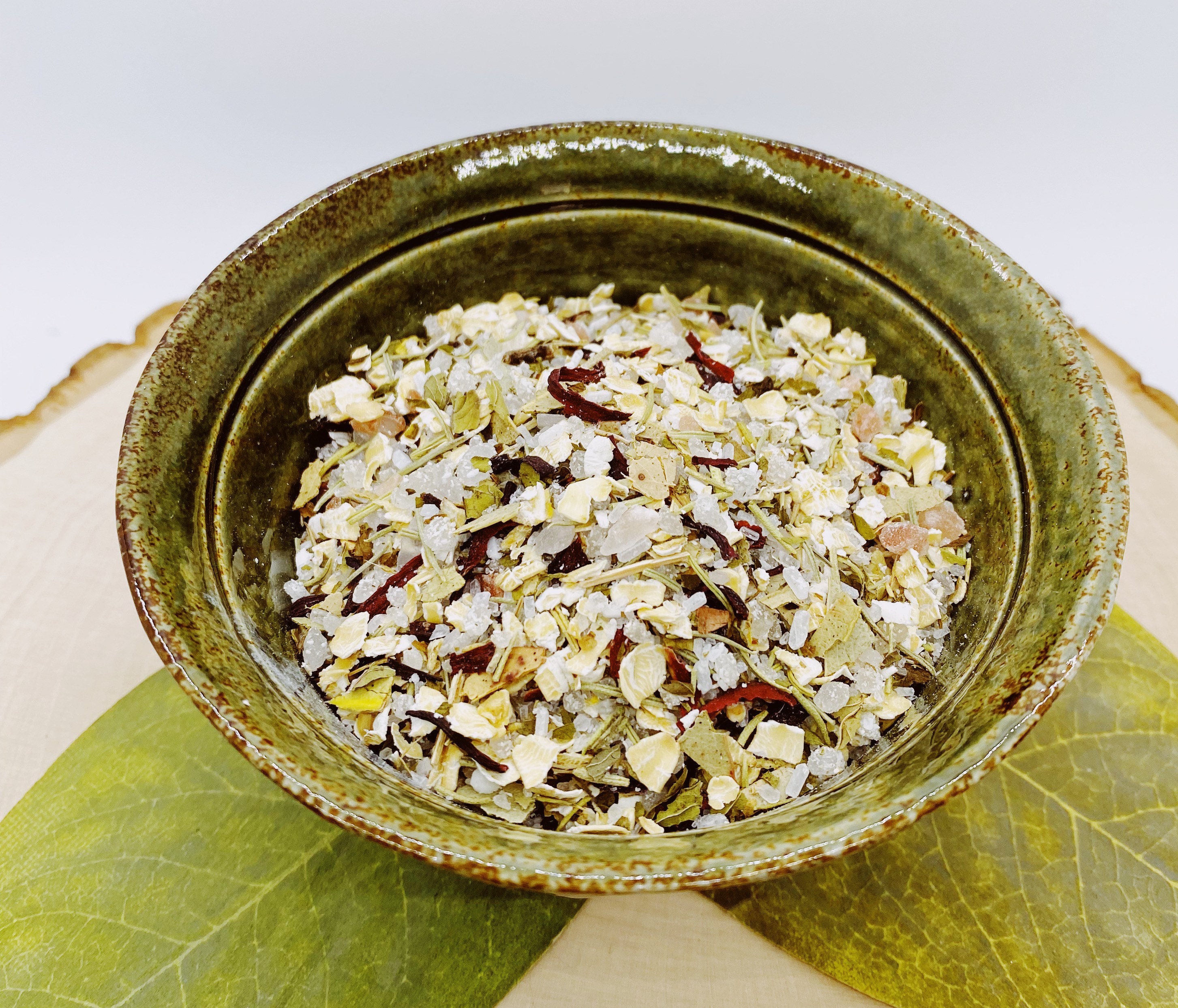 Ingredients: Oat, Epsom Salt, Dead Sea Salt, Peppermint Leaf, Eucalyptus Leaf, Rosemary, Hibiscus Flowers, Himalayan salt, Lavender, Cedarwood and Lemongrass essential oils.