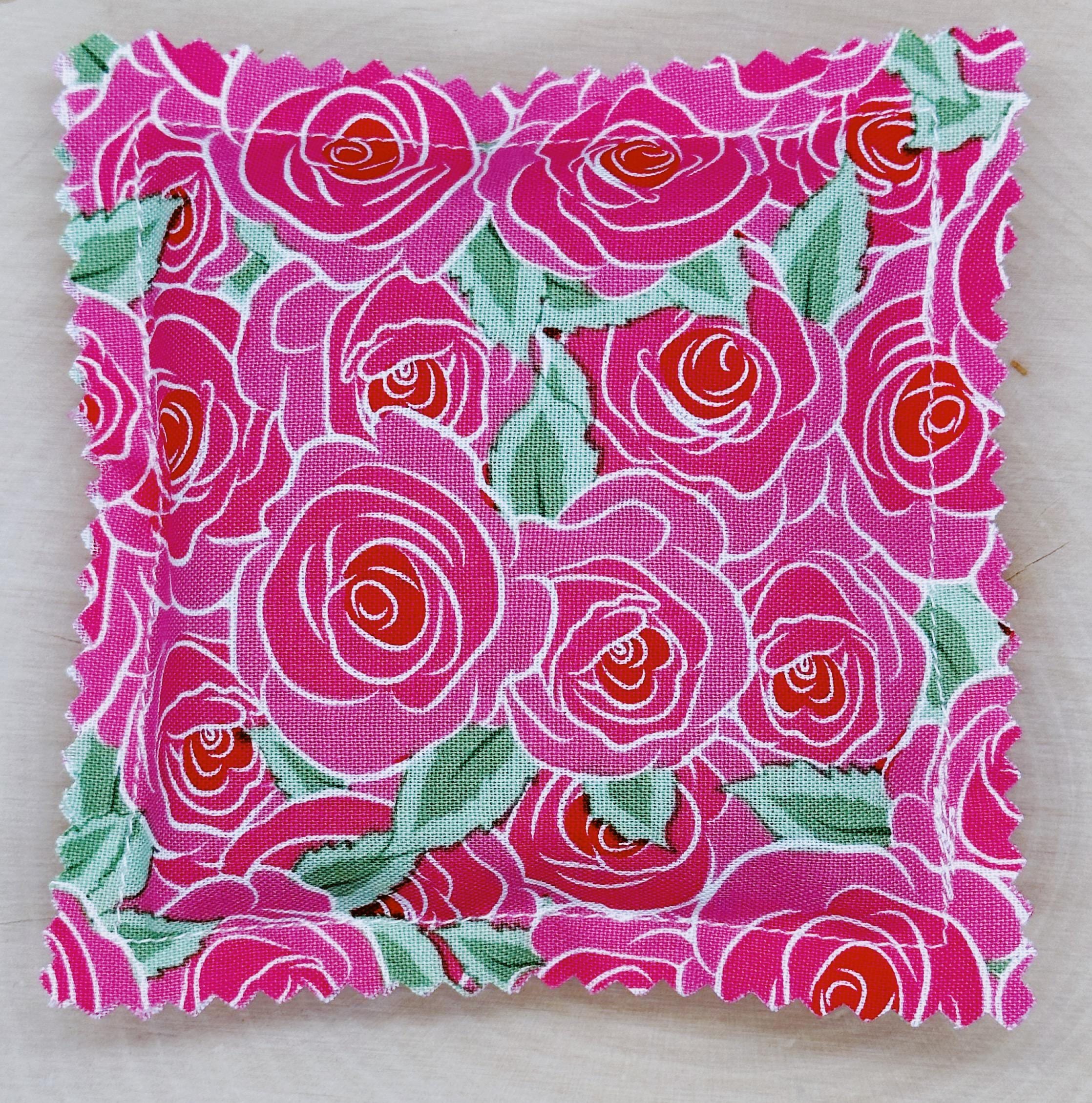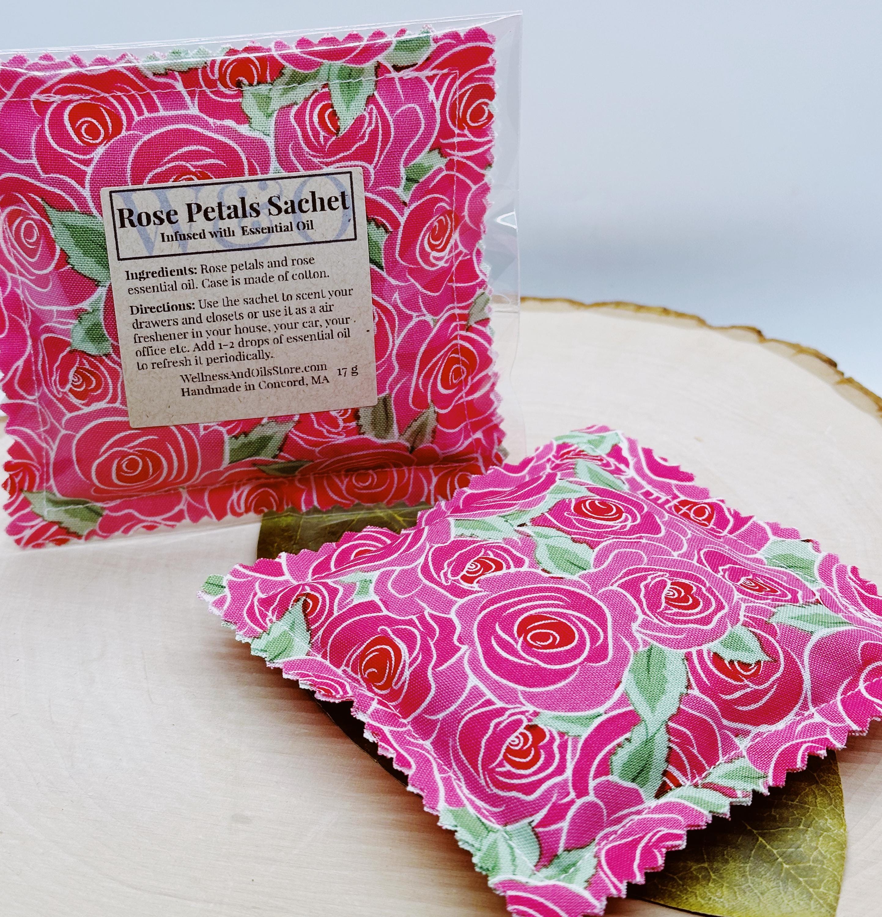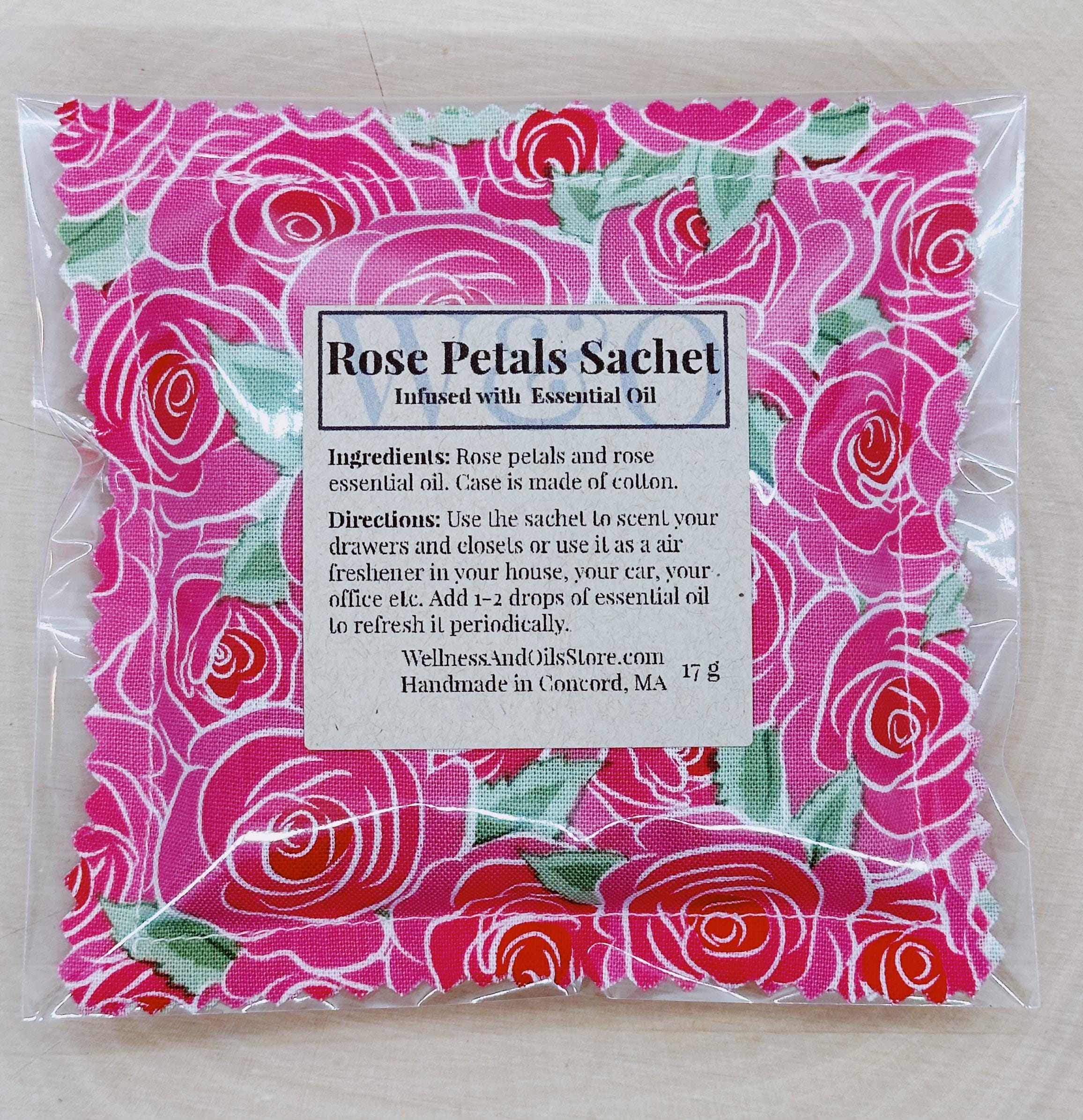 Those sachets are filled with Rose petals infused with rose essential oil. Use the sachet to scent your drawers and closets or use it as an air freshener in your house, your car, your office, etc.