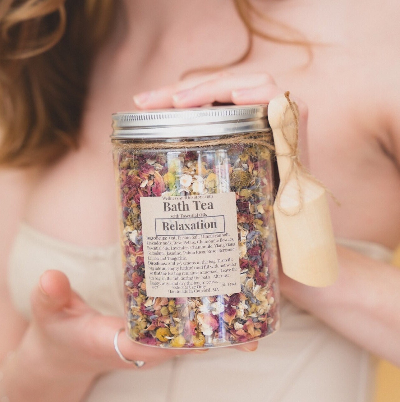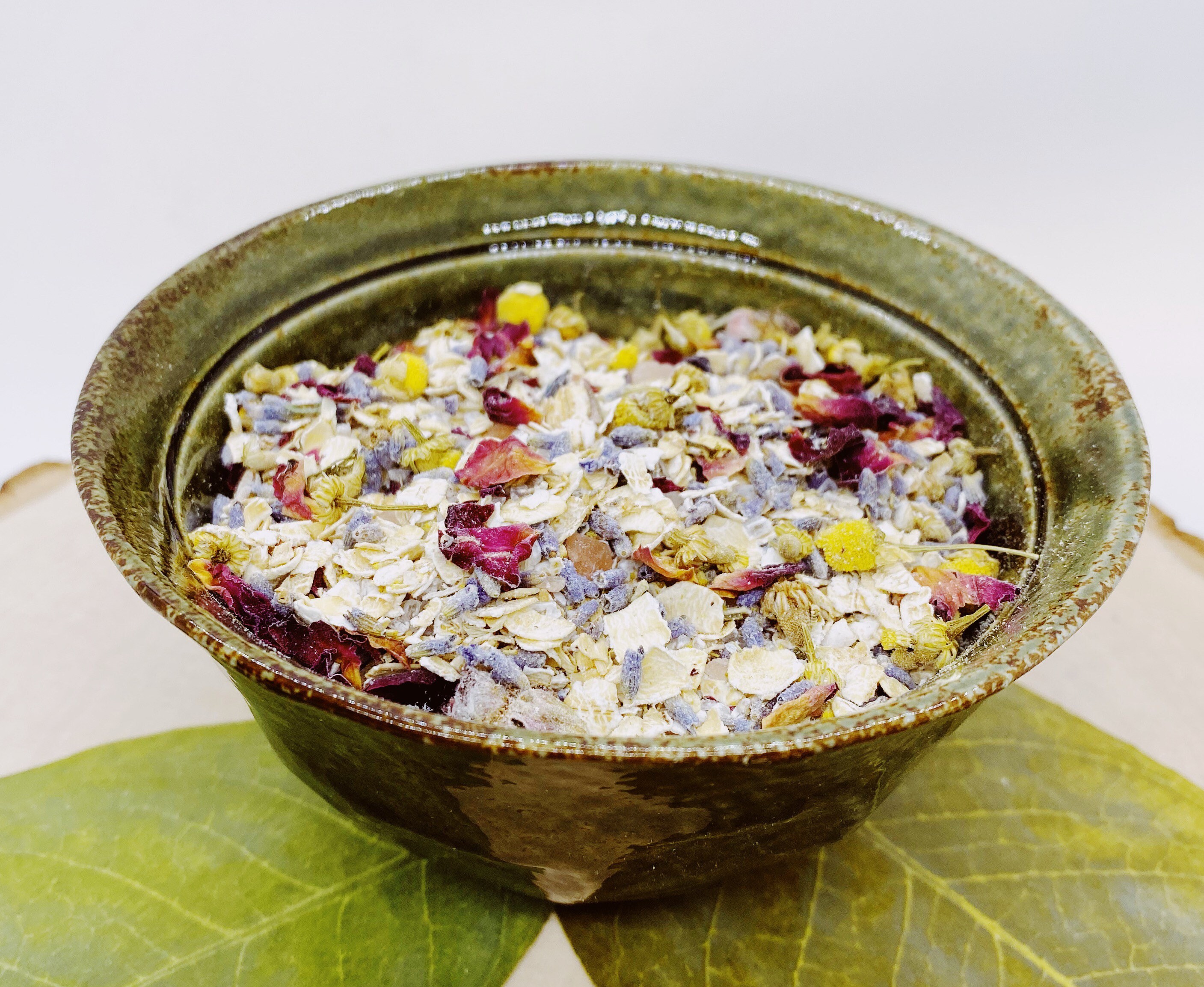 Ingredients: Oat, Epsom Salt, Himalayan salt, Lavender buds, Rose Petals, Chamomile flowers, Essential oils: Lavender, Chamomile, Ylang Ylang, Geranium, Jasmine, Palma Rosa, Rose, Bergamot, Lemon and Tangerine.